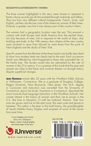 The three women highlighted in this story were chosen to represent a family whose records are all documented through husbands and fathers. They are from very different cultural backgrounds, French, Scots, and English, yet they are the true core of the American woman of their times. Diversity is greater now but it was always part of the country's fabric. The women had a geographic location near the sea. This ensured a contact with both Europe and South America from the earliest times, not only because of wars, but in response to the world of ships, ship building and trade. In the 19th century, few citizens of the new country were involved in news from abroad as were those from the ports of New England and the docks of New York. Specific events from the life time of the three Sarahs are briefly described to show how modern times are clearly tied to the past. Each successive Sarah was affected by what happened to those who preceded her on the family tree. The Sarahs would also be astonished by the role of women in the 21st century. It is a premise of this book that the past and present are clues to the future and common themes run through history despite superficial changes.