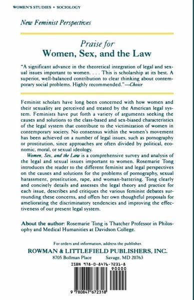 Feminist scholars have long been concerned with how women and sexuality are perceived and treated by the American legal system. Feminists have put forth a variety of arguments seeking the causes and solutions to the class-based and sex-biased characteristics of the legal system that contribute to the victimization of women in contemporary society. No consensus within the women's movement has been achieved on a number of legal issues, such as pornography or prostitution, since approaches are often divided by political, economic, moral, or sexual ideology.Women, Sex, and the Law is a comprehensive survey and analysis of the legal and sexual issues important to women. Rosemarie Tong introduces the reader to the different feminist and legal perspectives on the causes and solutions for the problems of pornography, sexual harassment, prostitution, rape, and woman-battering. Tong clearly and concisely details and assesses the legal theory and practice for each issue, describs and critiques the various feminist debates surrounding these concerns, and offers her own thoughtful proposals for ameliorating the discriminatory tendencies and improving the effectiveness of our present legal system.