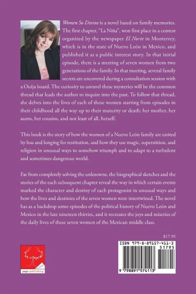 Women So Divine is a novel based on family memories. The first chapter, "La Nina," won first place in a contest organized by the newspaper El Norte in Monterrey, Mexico, which published it as a public interest story. In that initial episode, there is a meeting of seven women from two generations of the family. In that meeting, several family secrets are uncovered during a consultation session with a Ouija board. The curiosity to unravel these mysteries will be the common thread that leads the author to inquire into the past. To follow that thread, she delves into the lives of each of these women starting from episodes in their childhood all the way up to their maturity or death: her mother, her aunts, her cousins, and not least of all, herself. This book is the story of how the women of a Nuevo Leon family are united by loss and longing for restitution and how they use magic, superstition, and religion in unusual ways to somehow triumph and to adapt to a turbulent and sometimes dangerous world. Far from completely solving the unknowns, the biographical sketches and the stories of each subsequent chapter reveal the way in which certain events marked the character and destiny of each protagonist in unusual ways and how the lives and destinies of the seven women were intertwined. The novel has as a backdrop some episodes of the political history of Nuevo Leon and Mexico in the late 1930s, and it recreates the joys and miseries of the daily lives of these seven women of the Mexican middle class.