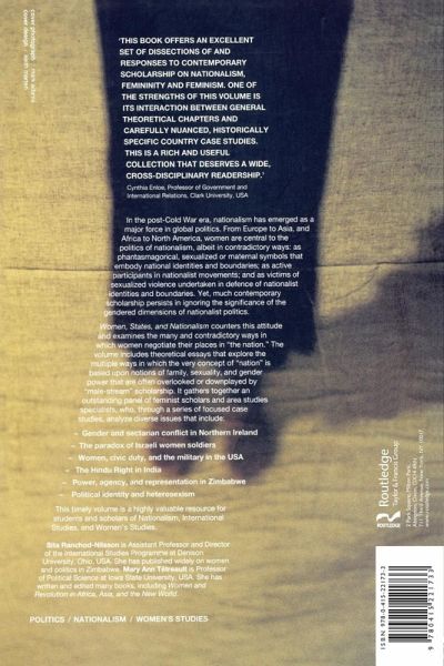 Women, States and Nationalism counters this attitude and examines the many and contradictory ways in which women negotiate their places in 'the nation'. The volume includes theoretical essays that explore the multiple ways in which the very concept of 'nation' is based upon notions of family, sexuality and gender power which are often overlooked of downplayed by 'male-stream' scholarship. It gathers together an outstanding panel of feminist scholars and area studies specialists, who, through a series of focused case studies, analyse diverse issues which include; *gender and sectarian conflict in Northern Ireland *the paradox of Israeli women soldiers *women, civic duty and the military in the USA *the Hindu Right in India *power, agency and representation in Zimbabwe *political identity and heterosexism. This timely volume is a highly valuable resource for students and scholars of Nationalism, Internationalism Studies and Women's Studies.
