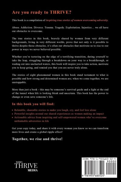 Are you ready to THRIVE?This book is a compilation of inspiring true stories of women overcoming adversity. Abuse. Addiction. Divorce. Trauma. Tragedy. Exploitation. Injustice... we all have our obstacles to overcome. The true stories in this book, bravely shared by women from very different backgrounds, living in very different worlds, prove that not only is it possible to thrive despite those obstacles, it's often our obstacles that motivate us to rise to our power in ways we never believed possible. Whether you're teetering on the edge of a terrifying transition, daring yourself to take the leap, struggling through a breakdown on your way to a breakthrough, or wading out into uncharted waters, this book will inspire you to take action, motivate you to keep going, and remind you that you are never truly alone. The stories of eight phenomenal women in this book stand as a testament to what is possible and how strong and determined women are; when we come together, we are unstoppable. More than just a book - this may be someone's survival guide and a light at the end of the tunnel when life is looking bleak and uncertain. This book has the power to change or even save someone's life. In this book you will find: Relatable, shareable stories to make you laugh, cry, and feel less alone Powerful insights around our shared experiences as women making an impact Actionable advice from inspiring and self-empowered women who've overcome unthinkable adversities in life Get your copy today, and share it with every woman you know so we can transform more lives and create a global ripple effect! Together, we rise and thrive!