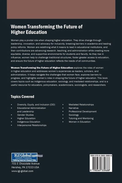Women play a pivotal role when shaping higher education. They drive change through leadership, innovation, and advocacy for inclusivity, breaking barriers in academia and leading policy reforms. Women are redefining what it means to lead in educational institutions, and their contributions are advancing research, teaching, and administration while creating more equitable, diverse, and supportive environments for students and faculty. As they rise in influence, women help to challenge traditional structures, foster greater access to education, and ensure the future of higher education reflects the needs of all communities. Women Transforming the Future of Higher Education explores the roles of women in higher education and addresses women s experiences as leaders, scholars, and administrators. It helps navigate the challenges that women face, explores barriers to progress, and highlights women s roles in shaping the future of higher education. This book covers topics such as indigenous education, sociology, and mediated relationships, and is a useful resource for educators, policymakers, academicians, sociologists, and researchers.