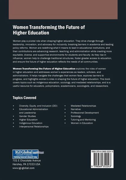 Women play a pivotal role when shaping higher education. They drive change through leadership, innovation, and advocacy for inclusivity, breaking barriers in academia and leading policy reforms. Women are redefining what it means to lead in educational institutions, and their contributions are advancing research, teaching, and administration while creating more equitable, diverse, and supportive environments for students and faculty. As they rise in influence, women help to challenge traditional structures, foster greater access to education, and ensure the future of higher education reflects the needs of all communities. Women Transforming the Future of Higher Education explores the roles of women in higher education and addresses women s experiences as leaders, scholars, and administrators. It helps navigate the challenges that women face, explores barriers to progress, and highlights women s roles in shaping the future of higher education. This book covers topics such as indigenous education, sociology, and mediated relationships, and is a useful resource for educators, policymakers, academicians, sociologists, and researchers.