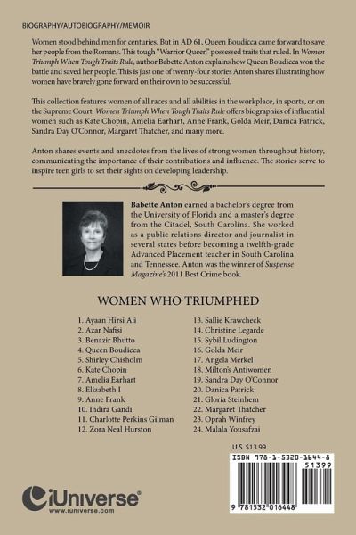 Women stood behind men for centuries. But in AD 61, Queen Boudicca came forward to save her people from the Romans. This tough "Warrior Queen" possessed traits that ruled. In Women Triumph When Tough Traits Rule, author Babette Anton explains how Queen Boudicca won the battle and saved her people. This is just one of twenty-four stories Anton shares illustrating how women have bravely gone forward on their own to be successful. This collection features women of all races and all abilities in the workplace, in sports, or on the Supreme Court. Women Triumph When Tough Traits Rule offers biographies of influential women such as Kate Chopin, Amelia Earhart, Anne Frank, Golda Meir, Danica Patrick, Sandra Day O'Connor, Margaret Thatcher, and many more. Anton shares events and anecdotes from the lives of strong women throughout history, communicating the importance of their contributions and influence. The stories serve to inspire teen girls to set their sights on developing leadership.