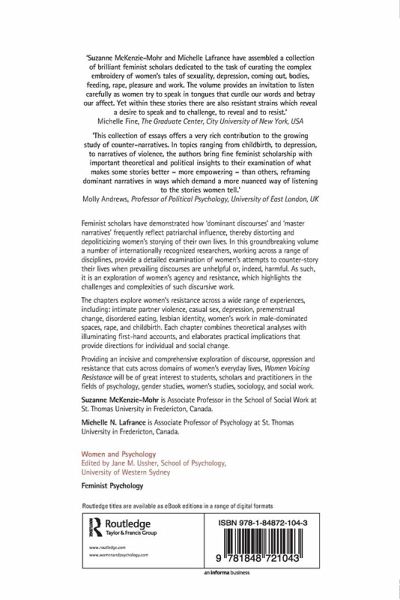 Feminist scholars have demonstrated how 'dominant discourses' and 'master narratives' frequently reflect patriarchal influence, thereby distorting and depoliticizing women's storying of their own lives. In this groundbreaking volume a number of internationally recognized researchers, working across a range of disciplines, provide a detailed examination of women's attempts to counter-story their lives when prevailing discourses are unhelpful or, indeed, harmful. As such, it is an exploration of women's agency and resistance, which highlights the challenges and complexities of such discursive work. The chapters explore women's resistance across a wide range of experiences, including: intimate partner violence, casual sex, depression, premenstrual change, disordered eating, lesbian identity, women's work in male-dominated spaces, rape, and child birth. Each chapter combines theoretical analyses with illuminating first-hand accounts, and elaborates practical implications that provide directions for individual and social change. Providing an incisive and comprehensive exploration of discourse, oppression and resistance, that cuts across domains of women's everyday lives, Women Voicing Resistance will be of great interest to students, scholars and practitioners in the fields of psychology, gender studies, women's studies, sociology, and social work.
