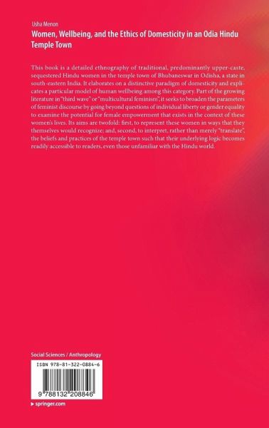 This book is a detailed ethnography of traditional, predominantly upper-caste, sequestered Hindu women in the temple town of Bhubaneswar in Odisha, a state in eastern India. It elaborates on a distinctive paradigm of domesticity and explicates a particular model of human wellbeing among this category. Part of the growing literature in "third wave" or "multicultural feminism", it seeks to broaden the parameters of feminist discourse by going beyond questions of individual liberty or gender equality to examine the potential for female empowerment that exists in the context of these women's lives. Its aims are twofold: first, to represent these women in ways that they themselves would recognize; and, second, to interpret, rather than merely "translate", the beliefs and practices of the temple town such that their underlying logic becomes readily accessible to readers, even those unfamiliar with the Hindu world.