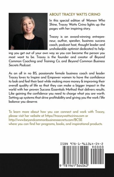 In this special edition of Women Who Shine, Tracey Watts Cirino lights up the pages with her inspiring story. Tracey is an award-winning entrepreneur, 5-Time #1 International Bestselling Author, speaker, business success coach, podcast host, thought leader, and unshakeable optimist dedicated to helping you get out of your own way so you can become the person you most want to be. Tracey is the founder and creator of Beyond Common Coaching and Training Co. and Beyond Common Business Secrets Podcast. As an all in no BS, passionate female business coach and leader Tracey loves to Inspire and Empower women to have the confidence to look and feel their best while making more money & improving their overall quality of life so that they can make a bigger impact in the world with her proven Success Essentials Method that delivers results. Like gaining the confidence you need to charge what you are worth. Setting up systems that drive profitability and give you the work/life balance you deserve. To learn more about how you can connect and work with Tracey, please visit her website at https://traceywattscirino.com or http://www.beyondcommonbusinesssecrets.com/BCSE where you can find her programs, books, and inspirational products. Empowering Transformation with Women Who Shine: Tracey Watts Cirino Edition! Embark on a transformative journey with Tracey Watts Cirino, an award-winning entrepreneur, 5-time #1 International bestselling author, and advocate for female empowerment. In this exclusive Light that Shine Bright edition of Women Who Shine, Tracey's inspiring story lights up the pages, inviting you to unlock your true potential and embrace a life of confidence, prosperity, and impact. Meet Tracey Watts Cirino: Your Guide to Unstoppable Success! Beyond being a business growth strategist and success coach, Tracey is a beacon of optimism, dedicated to helping you overcome self-doubt and become your best self. As the founder of Beyond Common Coaching and Training Co., Tracey empowers women to break free from limitations. Through her Beyond Common Business Secrets Podcast, she shares invaluable insights, guiding you to overcome obstacles and realize your dreams. Empowering Women to Thrive: The Beyond Common Way! Discover the proven Success Essentials Method, crafted by Tracey to boost your confidence, income, and overall quality of life. Imagine charging what you're worth, implementing systems that drive profitability, and achieving the work-life balance you desire. Tracey's approach isn't just about financial gain; it's about nurturing self-belief, empowering your spirit, and creating a meaningful impact. Uncover Your Potential: Where Confidence Meets Profitability! Are you ready to transform your life, increase your income, and make a lasting impression? Tracey's programs, books, and inspirational products are tailored to guide you on this empowering journey. Explore her transformative offerings at TraceyWattsCirino.com or BeyondCommonBusinessSecrets.com/BCSE