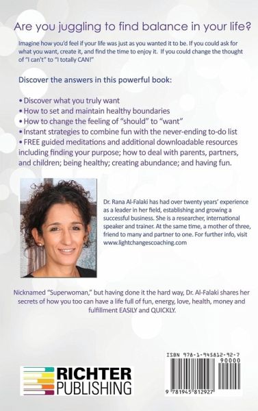 Are you juggling to find balance in your life?Imagine how you'd feel if your life was just as you wanted it to be. If you could ask for what you wanted, create it and find the time to enjoy it. If you could change the thought of "I can't' to "I totally CAN!' Discover the answers in this powerful book: Discover what you truly want How to set and maintain healthy boundaries How to change the feeling of 'should' to want' Instant strategies to combine fun with the never-ending 'to-do' list FREE guided meditations and additional downloadable resources including finding your purpose, how to deal with parents, partners and children, being healthy, creating abundance and having fun. Dr Rana Al-Falaki has had over twenty years' experience as a leader in her field, establishing and growing a successful business. She is a researcher, international speaker and trainer, and at the same time a mother of three, friend to many and partner to one. For further info, visit www.lightchangescoaching.com Nicknamed 'Super-woman', but having done it the hard way, she shares her secrets of how you too can have a life full of fun, energy, love, health, money and fulfillment EASILY and QUICKLY.