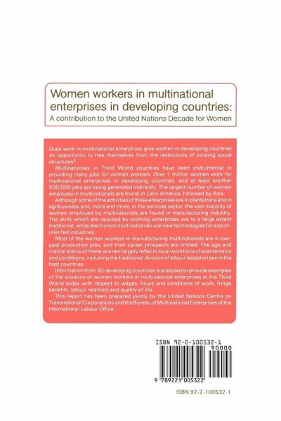Does work in multinational enterprises give women in developing countries an opportunity to free themselves from the restrictions of existing social structures? Information from 30 developing countries is analysed to provide examples of the situation of women workers in multinational enterprises in the Third World today with respect to wages, hours and conditions of work, fringe benefis, labour relations and quality of life. This report has been prepared jointly by the United Nations Centre on Transnational Corporations and the Bureau of Multinational Enterprises of the International Labour Office.