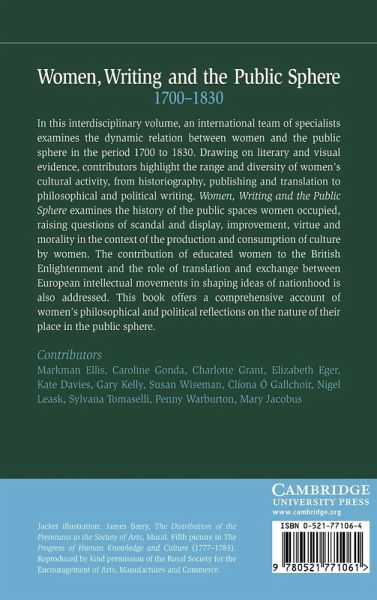 In this interdisciplinary volume, an international team of specialists examine the dynamic relation between women and the public sphere between 1700 and 1830. Drawing on literary and visual evidence, contributors highlight the range and diversity of women's cultural activity during the period, from historiography, publishing and translation to philosophical and political writing. Women, Writing and the Public Sphere examines the history of the public spaces women occupied, raising questions of scandal and display, improvement, virtue and morality in the context of the production and consumption of culture by women in eighteenth-century England. The contribution of educated women to the British Enlightenment and the role of translation and exchange between European intellectual movements in shaping ideas of nationhood is also addressed. This book offers a comprehensive account of women's philosophical and political reflections on the nature of their place in the public sphere.