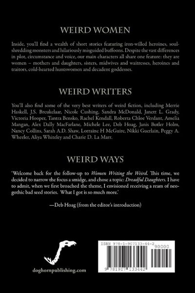 Inside, you'll find a wealth of short stories featuring iron-willed heroines, soul-shredding monsters and hilariously misguided buffoons. Despite the vast differences in plot, circumstance and voice, our main characters all share one feature: they are women - mothers and daughters, sisters, midwives and waitresses, heroines and traitors, cold-hearted huntswomen and decadent goddesses. Inside these pages, you'll find some of the very best writers of weird fiction, including Merrie Haskell, J.S. Breukelaar, Nicole Cushing, Sandra McDonald, Janett L. Grady, Victoria Hooper, Tantra Bensko, Rachel Kendall, Roberta Chloe Verdant, Amelia Mangan, Alex Dally MacFarlane, Michele Lee, Deb Hoag, Janis Butler Holm, Nancy Collins, Sarah A.D. Shaw, Lorraine H McGuire, Nikki Guerlain, Peggy A. Wheeler, Aliya Whiteley and Charie D. La Marr.