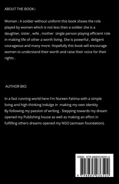 Women: A soldier without uniform this book shows the role played by women which is not less then a soldier she is a daughter, sister, wife, mother single person playing efficient role in making life of other a worth living. She is powerful, deligent courageous and many more. Hopefully this book will encourage women to understand their worth and raise their voice for their rights .