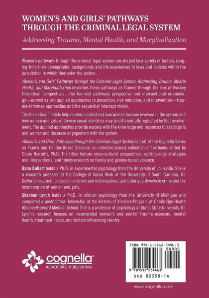"Women's pathways through the criminal legal system are shaped by a variety of factors, ranging from their demographic backgrounds and life experiences to laws and policies within the jurisdiction in which they enter the system. Women's and Girls' Pathways through the Criminal Legal System: Addressing Trauma, Mental Health, and Marginalization describes these pathways as framed through the lens of two key theoretical perspectives--the feminist pathways perspective and intersectional criminology--as well as two applied approaches to prevention, risk reduction, and intervention--trauma-informed approaches and the sequential intercept model. The theoretical models help readers understand how women become involved in the system and how women and girls of diverse social identities may be differentially impacted by that involvement. The applied approaches provide readers with the knowledge and resources to assist girls and women and decrease engagement with the system" --Provided by publisher.
