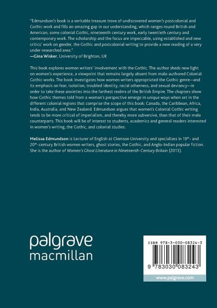 This book explores women writers' involvement with the Gothic. The author sheds new light on women's experience, a viewpoint that remains largely absent from male-authored Colonial Gothic works. The book investigates how women writers appropriated the Gothic genre-and its emphasis on fear, isolation, troubled identity, racial otherness, and sexual deviancy-in order to take these anxieties into the farthest realms of the British Empire. The chapters show how Gothic themes told from a woman's perspective emerge in unique ways when set in the different colonial regions that comprise the scope of this book: Canada, the Caribbean, Africa, India, Australia, and New Zealand. Edmundson argues that women's Colonial Gothic writing tends to be more critical of imperialism, and thereby more subversive, than that of their male counterparts. This book will be of interest to students and academics interested in women's writing, the Gothic, and colonial studies.