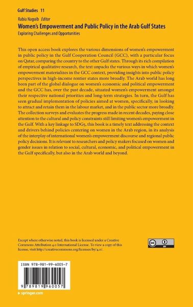 This Open Access book explores the various dimensions of women's empowerment in public policy in the Gulf Cooperation Council (GCC) region, with a particular focus on Qatar, comparing the country to the other Gulf states. Through its rich compilation of empirical qualitative research, the text unpacks the various ways in which women's empowerment materializes in the GCC context, providing insights into public policy perspectives in high-income rentier states more broadly. The Arab world has long been part of the global dialogue on women's economic and political empowerment and the GCC has, over the past decade, situated women's empowerment amongst their respective national priorities and long-term strategies. In turn, the Gulf has seen gradual implementation of policies aimed at women, specifically, in looking to attract and retain them in the labour market, and in the public sector more broadly. The collection surveys and evaluates the progress made in recent decades, paying close attention to the cultural and policy constraints still limiting women's empowerment in the Gulf. With a key linkage to SDG5, this book is a timely text addressing the context and drivers behind policies centering on women in the Arab region, in its analysis of the interplay of international women's empowerment discourse and regional public policy decisions. It is relevant to researchers and policy makers focused on women and gender issues in relation to social, cultural, economic, and political empowerment in the Gulf specifically, but also in the Arab world and beyond.