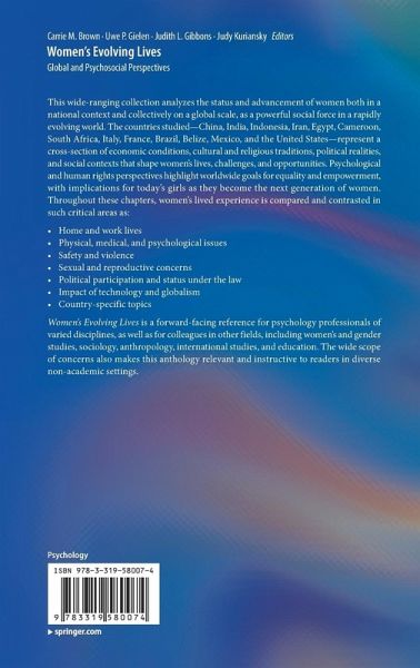 The Status of Women: Worldwide Trends.- Women's Lives in Contemporary Chinese Societies.- About Asian Indian Women: Stereotypes, Fabrications, and Lived Realities.- Women in Indonesia.- Women in Iran.- Women in Egypt.- Psychosocial Perspectives of Cameroonian Women.- Women in South Africa: Striving for Full Equality Post-Apartheid.- Women's Identities and Roles in Italy.- Women Today in French Society.- The Status of Women: Brazil.- Women in Mexico: Advances in Their Status and Well-being.- Women in Belize.- Women in the United States.