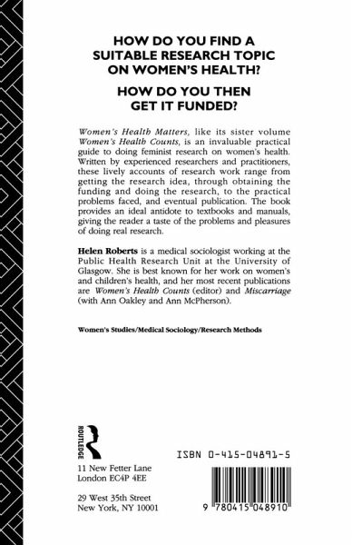Women's Health Matters, like its sister volume Women's Health Counts, is an invaluable practical guide to doing feminist research on women's health. Written by experienced researchers and practitioners, these lively accounts of research work range from getting the research idea, through obtaining the funding and doing the research, to the practical problems faced, and eventual publication. The book provides an ideal antidote to textbooks and manuals, giving the reader a taste of the problems and pleasures of doing real research.
