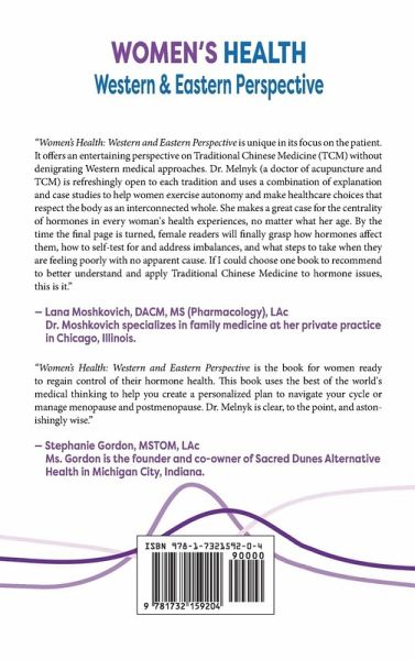 Women face unique challenges in daily life. Health is no exception. With their complex, interlocking systems for ovulation, reproduction, and hormone regulation, plus doctors' unfortunate tendency to assume female hysteria and hypochondria, too many women don't get the medical attention they need. This book can help women feel better about their health and their lives. Western and Traditional Chinese Medicine (TCM) both have something to offer; Dr. Melnyk's Women's Health: Western and Eastern Perspective is the first book that guides women to appropriate western and TCM responses to various ailments. It zeroes in especially on those issues specific to women, like hormones, infertility, menstrual problems, menopause, and sexual symptoms. Dr. Melnyk helps women rebalance their hormonal health through nutritional, herbal medicine, exercise, and other remedies. Readers will find charts, diagrams, pictures, and plenty of vivid stories from patients who reached an impasse with the western medical system and found relief through TCM. It teaches how women can take charge of their hormones, instead of the other way around. The book is an excellent resource for patients, practitioners, educators, and TCM enthusiasts.