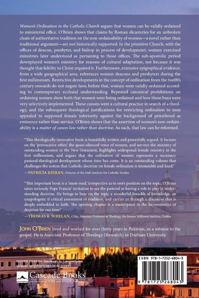 Women's Ordination in the Catholic Church argues that women can be validly ordained to ministerial office. O'Brien shows that claims by Roman dicasteries for an unbroken chain of authoritative tradition on the non-ordainability of women--a novel rather than traditional argument--are not historically supported. In the primitive Church, with the offices of deacon, presbyter, and bishop in process of development, women exercised ministries later understood as pertaining to those offices. The sub-apostolic period downplayed women's ministry for reasons of cultural adaptation, not because it was thought that fidelity to Christ required it. Furthermore, extensive epigraphical evidence, from a wide geographical area, references women deacons and presbyters during the first millennium. Restrictive developments in the concept of ordination from the twelfth century onwards do not negate how, before that, women were validly ordained according to contemporary ecclesial understanding. Repeated canonical prohibitions on ordaining women show both that women were being ordained and how those bans were very selectively implemented. These canons were a cultural practice in search of a theology, and the subsequent theological justifications for restricting ordination to men appealed to supposed female inferiority against the background of priesthood as eminence rather than service. O'Brien shows that the assertion of women's non-ordainability is a matter of canon law rather than doctrine. As such, that law can be reformed.