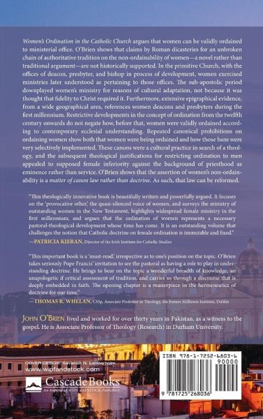Women's Ordination in the Catholic Church argues that women can be validly ordained to ministerial office. O'Brien shows that claims by Roman dicasteries for an unbroken chain of authoritative tradition on the non-ordainability of women--a novel rather than traditional argument--are not historically supported. In the primitive Church, with the offices of deacon, presbyter, and bishop in process of development, women exercised ministries later understood as pertaining to those offices. The sub-apostolic period downplayed women's ministry for reasons of cultural adaptation, not because it was thought that fidelity to Christ required it. Furthermore, extensive epigraphical evidence, from a wide geographical area, references women deacons and presbyters during the first millennium. Restrictive developments in the concept of ordination from the twelfth century onwards do not negate how, before that, women were validly ordained according to contemporary ecclesial understanding. Repeated canonical prohibitions on ordaining women show both that women were being ordained and how those bans were very selectively implemented. These canons were a cultural practice in search of a theology, and the subsequent theological justifications for restricting ordination to men appealed to supposed female inferiority against the background of priesthood as eminence rather than service. O'Brien shows that the assertion of women's non-ordainability is a matter of canon law rather than doctrine. As such, that law can be reformed.