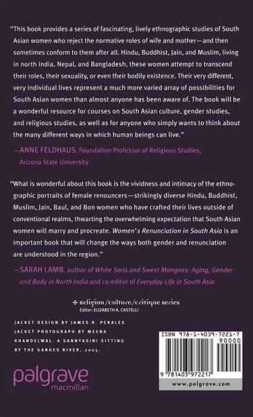 'This book provides a series of fascinating, lively ethnographic studies of South Asian women who reject the normative roles of wife and mother and then sometimes conform to them after all. Hindu, Buddhist, Jain, and Muslim, living in north India, Nepal and Bangladesh, these women attempt to transcend their roles, their sexuality, or even their bodily existence. Their very different, very individual lives represent a much more varied array of possibilities for South Asian women than almost anyone has been aware of. The book will be a wonderful resource for courses on South Asian culture, gender studies, and religious studies, as well as for anyone who simply wants to think about the many different ways in which human beings can live.' Anne Feldhaus, Foundation Professor of Religious Studies, Arizona State University