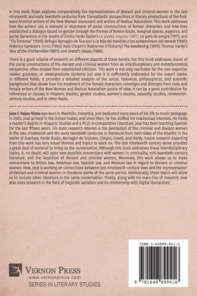 In this book, Rojas explores comparatively the representations of deviant and criminal women in the late nineteenth and early twentieth centuries from Transatlantic perspectives in literary productions of the first-wave feminist writers of the New Woman movement and writers of Radical Naturalism. This work addresses how the writers' sex is relevant in depictions of social constructions of female characters and how they established a dialogue based on gender through the themes of 'femme fatale', marginal spaces, eugenics, and social Darwinism in the novels of Emilia Pardo Bazán's 'La piedra angular' (1891), 'La gota de sangre' (1911), and "Tio Terrones" (1920); Refugio Barragán de Toscano's 'La hija del bandido o los subterráneos del nevado' (1887); Federico Gamboa's 'Santa' (1903); Kate Chopin's (Katherine O'Flaherty) 'The Awakening' (1899); Thomas Hardy's 'Tess of the D'Urbervilles' (1891); and 'Grand's Ideala' (1888). There is a good volume of research on different aspects of these novels, but this book addresses issues of the social constructions of deviant and criminal women from an interdisciplinary and metatheoretical perspective often missed from established criticism. This work is not only reachable for the non-expertise reader, graduate, or undergraduate students but also it is sufficiently elaborated for the expert reader in different fields. It provides a detailed analysis of the social, historical, philosophical, and scientific background that shows how the treatment of the female characters converges and diverges from male and female writers of the New Woman and Radical Naturalism points of view. It can be a good contribution for references or classes in Hispanic studies, gender studies, women's studies, sexuality studies, nineteenth-century studies, and in other fields.