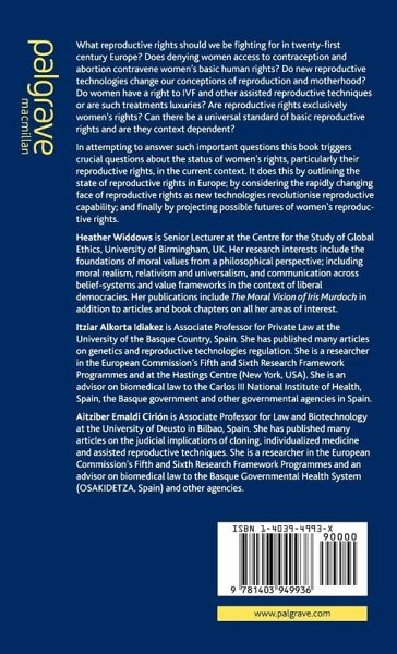List of Figures List of Tables Acknowledgements Foreword Notes on Contributors Introduction; H.Widdows PART I: TENSIONS IN EUROPE; CRITICAL ISSUES IN REPRODUCTIVE RIGHTS Abortion - A Reproductive Right; C.Kenny Adoption: Practices and Regulations: F.MacCallum Birth Rate and Women's Rights in Europe; P.de Villota Teenage Pregnancy; O.Tóth Minority Groups and Reproductive Rights; N.Trehan & I.Crowhurst PART II: THE IMPACT OF TECHNOLOGY; SCIENCE ADVANCES AND REPRODUCTIVE RIGHTS Women's Rights in European Fertility Medicine Regulation; I.Alkorta Idiakez How is Technology Changing the Meaning of Motherhood for Western Women?; L.B.Andrews Preimplantation Diagnosis: Problems and Future Perspectives; A.Emaldi Cirión The Impact of New Reproductive Technologies on Concepts of Genetic Relatedness and Non Relatedness; H.Widdows PART III: INTO THE FUTURE; PROJECTIONS FOR REPRODUCTIVE RIGHTS Reproductive Rights in the Twenty-First Century; H.Haker Ownership, Property and Women's Bodies; D.Dickenson Beyond Europe: Rhetoric of Reproductive Rights in Global Population Policies; S.K.Hellsten Bibliography Index
