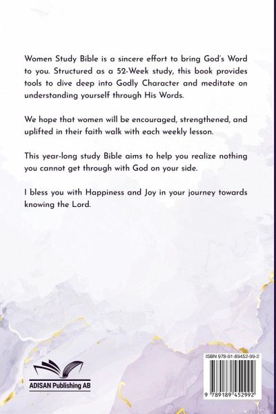 Want to read the NIV Bible in 52 Weeks as a Bible Study group?Looking for Bible Journaling? Here's a refreshing approach to New International Version (NIV (TM)) Bible study for women. It combines a daily reading plan with weekly reflections to explore how God's Words can be applied to your daily life. Theme Based Weekly Study: Each week has a theme and related daily Bible verses for reference. This helps in cultivating a habit of focusing on learnings from the NIV (TM) Bible. Weekly Reflection: A reflection of the weekly bible scriptures provides a synopsis for easy understanding of the scriptures. Bible Journaling: Each week has journaling questions for applying wisdom from Bible to your life. These are a source of engaging your mind, your heart, and your will. Each week is based on a theme of Godly Characteristics:God is faithful and True God Keeps Promises God saves through Faith God is Wise God is Blameless God is Glorious God is All-Powerful God of Miracles One Year New International Version Bible (NIV (TM)) Study makes reading through the Bible achievable. ¿Copyright: All scripture quotations, unless otherwise indicated, are taken from the HOLY BIBLE, NEW INTERNATIONAL VERSION®, NIV®. Copyright (c) 1973, 1978, 1984, 2011 by Biblica, Inc. (TM) used by permission. All rights reserved worldwide.