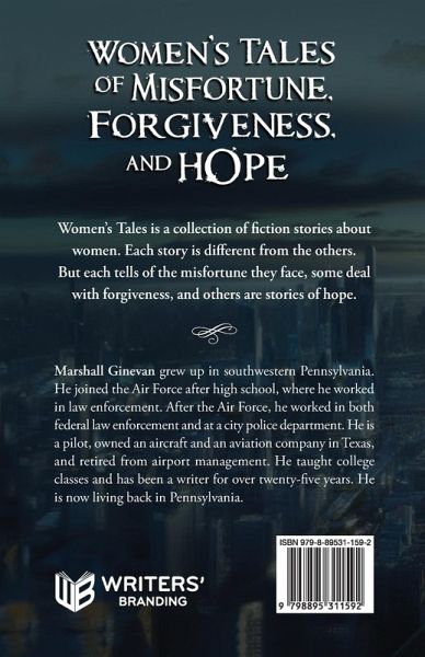 Synopsis: Women's Tales is a collection of fiction stories about women. Each story is different from the others. But each tells of the misfortune they face, some deal with forgiveness, and others are stories of hope. Autobiography: Marshall Ginevan grew up in southwestern Pennsylvania. He joined the Air Force after high school, where he worked in law enforcement. After the Air Force, he worked in both federal law enforcement and at a city police department. He is a pilot, owned an aircraft and an aviation company in Texas, and retired from airport management. He taught college classes and has been a writer for over twenty-five years. He is now living back in Pennsylvania