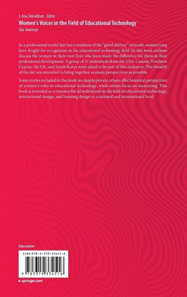 Ana's Voice: It's All About the Journey.- Kay's Voice: Never in My Wildest Dreams.- Sharon and Mary's Voices: Sisterhood - The Journey.- Tonia's Voice: From the Dirt Roads to the Ivory Tower.- Marcy's Voice: The Road Less Traveled.- Linda's Voice: Life Events Don't Define You - You Do!.- Elizabeth's Voice: Those Who Came Before Us - Jane Wheeler Boling.- Ali's Voice: Pathways toward Balance.- Ellen's Voice: The Long and Winding Road to Educational Communications and Technology Enlightenment.- Rhonda's Voice: And Gladly Would She Learn, and Gladly Teach.- Gráinne's Voice: The Journey from Chemistry to E-learning.- Pat's Voice: A Journey towards Wisdom.- Insung's Voice: Great People, Boundless Opportunities, and Meaningful Changes.- Monica's Voice: Developing Designer Professional Identity.- Angela's Voice: Cherish the Support, Nurture the Relationships,- Eugene's Voice: Women leaders Guiding my Ethics of Caring.- Gayle's Voice: My Journey of How I Got to Now.- Will's Voice: The AcademicRoad - Thorns and Roses.- Joi's Voice: The Lights Along my Path.- Amy's Voice: Becoming Fully Human in our Professional Roles.- Krista's Voice: The Transformative Influence of Negative and Positive Experiences.- Paralleling Women as President of AECT with Changes in U.S. Laws and Social Norms.- Early Women Involved in Educational Technology: Vignettes.- Technology and Generational Learners: From Baby Boomers to Next Generators, to Millennials, to Netters, to Guess What is Coming!.- (Ward's) Ten Principles of Effective Mentoring.- Investing in our Future: the Role of Intentional Mentorship.- Mentoring and the Role of Women in Instructional Design and Technology.- Being Role Models in Leadership in the Field of Educational Technology.
