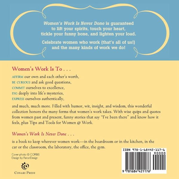Not to be confused with Alice's famous remark on a memorable episode of the Honeymooners, "Men work from sun to sun, but women's work is never done," Women's Work Is Never Done by BJ Gallagher celebrates the fact that women's work is never done because it's never meant to be done. Women are meant to nourish and grow themselves and others, throughout their lives, and Gallagher's book acknowledges and affirms it.