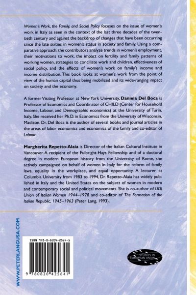 The Editors: A former Visiting Professor at New York University, Daniela Del Boca is Professor of Economics and Coordinator of CHILD (Center for Household Income, Labour, and Demographic economics) at the University of Turin, Italy. She received her Ph.D. in Economics from the University of Wisconsin, Madison. Dr. Del Boca is the author of several books and journal articles in the areas of labor economics and economics of the family and co-editor of Labour. Margherita Repetto-Alaia is Director of the Italian Cultural Institute in Vancouver. A recipient of the Fulbright-Hays Fellowship and of a doctoral degree in modern European history from the University of Rome, she actively campaigned on behalf of women in Italy for the reform of family laws, equality in the workplace, and equal opportunity. A lecturer at Columbia University from 1983 to 1994, Dr. Repetto-Alaia has widely published in Italy and the United States on the subject of women in modern and contemporary social and political movements. She is co-author of UDI Union of Italian Women 1944-1978 and co-editor of The Formation of the Italian Republic, 1945-1963 (Peter Lang, 1993).