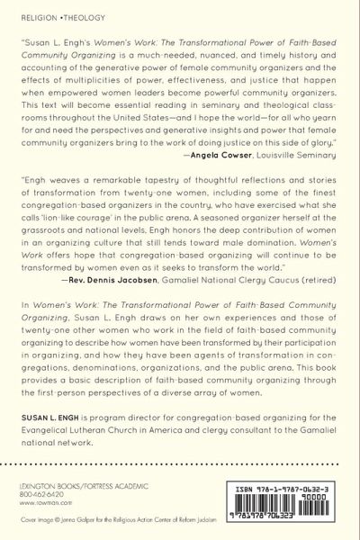 Women’s Work draws on Susan L. Engh’s experiences and those of 21 other women in faith-based organizing to demonstrate how women have been transformed and been agents of transformation. The various arenas described include religious congregations, denominations, community organizations, and the public square.