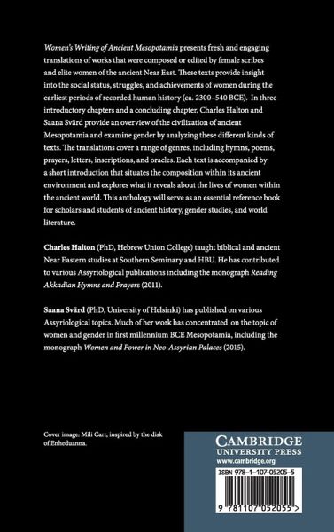 Women's Writing of Ancient Mesopotamia presents fresh and engaging translations of works that were composed or edited by female scribes and elite women of the ancient Near East. These texts provide insight into the social status, struggles, and achievements of women during the earliest periods of recorded human history (c.2300-540 BCE). In three introductory chapters and a concluding chapter, Charles Halton and Saana Svärd provide an overview of the civilization of ancient Mesopotamia and examine gender by analyzing these different kinds of texts. The translations cover a range of genres, including hymns, poems, prayers, letters, inscriptions, and oracles. Each text is accompanied by a short introduction that situates the composition within its ancient environment and explores what it reveals about the lives of women within the ancient world. This anthology will serve as an essential reference book for scholars and students of ancient history, gender studies, and world literature.