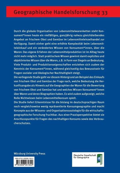 Durch die globale Organisation von Lebensmittelwarenketten steht Konsument*innen heute ein vielfältiges, ganzjährig nahezu gleichbleibendes Angebot an frischem Obst und Gemüse im Lebensmitteleinzelhandel zur Verfügung. Damit einher geht eine erhöhte Komplexität beim Lebensmitteleinkauf und ein verändertes Wissen von Konsument*innen, über die Waren: Das eigene Erfahren der Lebensmittelproduktion ist im Alltag heute nicht mehr möglich. Statt praktischem Wissen gewinnt damit explizites und objektiviertes Wissen über die Waren, z.B. in Form von Siegeln an Bedeutung. Viele Produkt- und Produktionseigenschaften entziehen sich zudem der Kenntnis der Konsument*innen, während gleichzeitig das Bewusstsein für Fragen sozialer und ökologischer Nachhaltigkeit steigt. Die vorliegende Studie geht vor diesem Hintergrund am Beispiel des Einkaufs von frischem Obst und Gemüse der Frage nach, welche Bedeutung die Herkunftsangabe als Hinweis auf die Geographien der Waren für die Bewertung von frischem Obst und Gemüse hat und welches Wissen Konsument*innen über Waren und deren Biographien haben. Es wird zudem aufgezeigt, welche Rolle Nichtwissen beim Lebensmittelkonsum spielt. Die Studie liefert Erkenntnisse für die bislang im deutschsprachigen Raum noch vergleichsweise wenig repräsentierte Konsumgeographie und macht Konzepte aus der Wissens- und Organisationssoziologie für die wirtschaftsgeographische Forschung fruchtbar. Aus einer Praxisperspektive bietet sie Anschlusspunkte für Fragen des nachhaltigen Konsums sowie des Verbraucherschutzes.