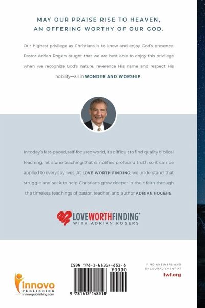 ¿¿¿¿¿¿¿- MAY OUR PRAISE RISE TO HEAVEN, AN OFFERING WORTHY OF OUR GOD. ¿¿¿¿¿¿¿- Our highest privilege as Christians is to know and enjoy God's presence. Pastor Adrian Rogers taught that we are best able to enjoy this privilege when we recognize God's nature, reverence His name and respect His nobility-all in WONDER AND WORSHIP. This 90-day devotional presents a collection of Pastor Rogers' best thoughts about getting right with God so we can rediscover the true wonder of worship. Each day's devotion begins with targeted scripture verses, followed by Adrian's exhortations, and concludes with three application-focused questions with space to record your thoughts. God is present in our worship whether we are alone in quiet time, with a group, or at a large church gathering. The King of kings is in our midst, and each of us can rekindle the wonder of worship by recognizing God's nature, reverencing His name, and respecting His nobility. ¿¿¿¿¿¿¿-ABOUT THE AUTHOR: In today's fast-paced, self-focused world, it's difficult to find quality biblical teaching, let alone teaching that simplifies profound truth so it can be applied to everyday lives. At LOVE WORTH FINDING, we understand that struggle and seek to help Christians grow deeper in their faith through the timeless teachings of pastor, teacher, and author ADRIAN ROGERS. -ABOUT THE PUBLISHER: Innovo Publishing LLC is a Christian publisher located near Memphis, TN. Since 2008, Innovo has been publishing quality books, eBooks, audiobooks, music, screenplays, film, and online and physical curricula that support the Great Commission, equip Believers, and help create a positive Christian worldview. Innovo's capabilities and global reach provide Christian authors, artists and ministries access to the world for Christ. To learn more about Innovo Publishing, visit our website at innovopublishing.com. To connect with other Christian creatives and to learn best practices for creating, publishing, marketing, and selling Christian titles, visit the Christian Publishing Portal at cpportal.com.