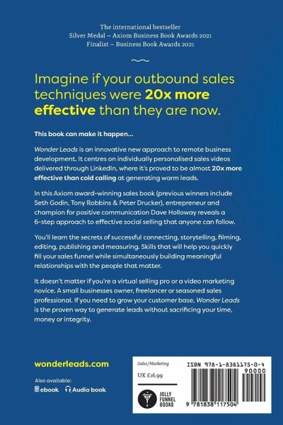 Imagine if your outbound sales techniques were 20x more effective than they are now. This book can make it happen... Wonder Leads is an innovative new approach to remote business development. It centres on individually personalised sales videos delivered through LinkedIn, where it's proved to be almost 20x more effective than cold calling at generating warm leads. In this Axiom award-winning sales book (previous winners include Seth Godin, Tony Robbins & Peter Drucker), entrepreneur and champion for positive communication Dave Holloway reveals a 6-step approach to effective social selling that anyone can follow. You'll learn the secrets of successful connecting, storytelling, filming, editing, publishing and measuring. Skills that will help you quickly fill your sales funnel while simultaneously building meaningful relationships with the people that matter. It doesn't matter if you're a virtual selling pro or a video marketing novice. A small businesses owner, solopreneur, start-up founder, freelancer or seasoned sales professional. If you need to grow your customer base, Wonder Leads is the proven way to generate leads without sacrificing your time, money or integrity. - In this book, you'll discover:Why traditional outbound sales techniques like telemarketing, email marketing and direct mail do more harm than good. How to sell yourself through an engaging LinkedIn profile that encourages customers to connect. Which small details make big differences to social selling success. The reason personalised video marketing is perfect for remote B2B selling, especially for a small business. Why positivity makes or breaks social selling efforts. How deeper sales video personalisation can increase B2B lead generation rates by 3x. Why high-quality personalised video marketing leads to profitable sales conversations. How to overcome the challenges of recording a personalised sales video on your own. Why empathy is the most critical component of successful prospecting. Why persistent sales follow-ups are suicide for your business development efforts. How to measure results to prove ROI and accurately forecast B2B lead generation. Buy Wonder Leads and start growing your B2B business today.