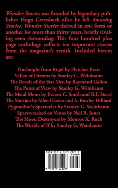 Wonder Stories was founded by legendary publisher Hugo Gernsback after he left Amazing Stories. Wonder Stories thrived in one form or another for more than thirty years, briefly rivaling even Astounding. This four hundred plus page anthology collects ten important stories from the magazine's zenith. If you enjoyed this book, you'll want to search on "Positronic Publishing Super Pack" and check out all our other Super Packs! Included herein are:Onslaught from Rigel by Fletcher Pratt Valley of Dreams by Stanley G. Weinbaum The Revolt of the Star Men by Raymond Gallun The Point of View by Stanley G. Weinbaum The Metal Moon by Everett C. Smith and R.F. Starzl The Martian by Allen Glasser and A. Rowley Hilliard Pygmalion's Spectacles by Stanley G. Weinbaum Spacewrecked on Venus by Neil R. Jones The Moon Destroyers by Monroe K. Ruch The Worlds of If by Stanley G. Weinbaum