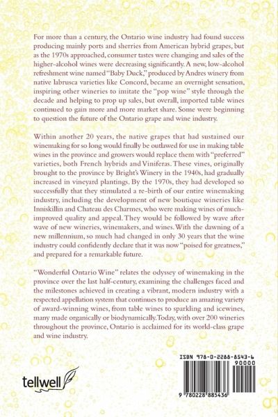 For more than a century, the Ontario wine industry had found success producing mainly ports and sherries from American hybrid grapes, but as the 1970s approached, consumer tastes were changing and sales of the higher-alcohol wines were decreasing significantly. A new, low-alcohol refreshment wine named "Baby Duck," produced by Andres winery from native labrusca varieties like Concord, became an overnight sensation, inspiring other wineries to imitate the "pop wine" style through the decade and helping to prop up sales, but overall, imported table wines continued to gain more and more market share. Some were beginning to question the future of the Ontario grape and wine industry. Within another 20 years, the native grapes that had sustained our winemaking for so long would finally be outlawed for use in making table wines in the province and growers would replace them with "preferred" varieties, both French hybrids and Viniferas. These vines, originally brought to the province by Bright's Winery in the 1940s, had gradually increased in vineyard plantings. By the 1970s, they had developed so successfully that they stimulated a re-birth of our entire winemaking, including the development of new boutique wineries like Inniskillin and Chateau des Charmes, who were making wines of much-improved quality and appeal. They would be followed by wave after wave of new wineries, winemakers, and wines. With the dawning of a new millennium, so much had changed in only 30 years that the wine industry could confidently declare that it was now "poised for greatness," and prepared for a remarkable future. "Wonderful Ontario Wine" relates the odyssey of winemaking in the province over the last half-century, examining the challenges faced and the milestones achieved in creating a vibrant, modern industry with a respected appellation system that continues to produce an amazing variety of award-winning wines, from table wines to sparkling and icewines, many made organically or biodynamically. Today, with over 200 wineries throughout the province, Ontario is acclaimed for its world-class grape and wine industry.