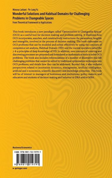 This book introduces a new paradigm called 'Optimization in Changeable Spaces' (OCS) as a useful tool for decision making and problem solving. It illustrates how OCS incorporates, searches, and constructively restructures the parameters, tangible and intangible, involved in the process of decision making. The book elaborates on OCS problems that can be modeled and solved effectively by using the concepts of competence set analysis, Habitual Domain (HD) and the mental operators called the 7-8-9 principles of deep knowledge of HD. In addition, new concepts of covering and discovering processes are proposed and formulated as mathematical tools to solve OCS problems. The book also includes reformulations of a number of illustrative real-life challenging problems that cannot be solved by traditional optimization techniques into OCS problems, and details how they can be addressed. Beyond that, it also includes perspectives related to innovation dynamics, management, artificial intelligence,artificial and e-economics, scientific discovery and knowledge extraction. This book will be of interest to managers of businesses and institutions, policy makers, and educators and students of decision making and behavior in DBA and/or MBA.