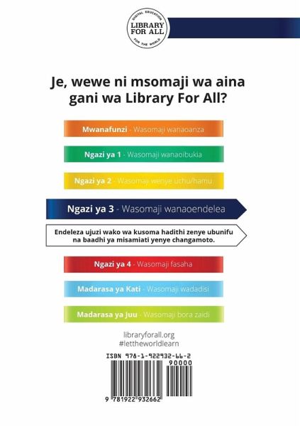 The sun starts to drink all the water in the world, and the animals complain to the moon. The moon began coming into the sky earlier. But then there was too much water! The animals decided the sun and moon would share their time in the sky. Jua huanza kunywa maji yote duniani, na wanyama hulalamika kwa mwezi. Mwezi ulianza kuja angani mapema. Lakini basi kulikuwa na maji mengi! Wanyama waliamua jua na mwezi zingeshiriki wakati wao angani. Your purchase of this book supports Library For All in its mission to make knowledge available to all, equally.