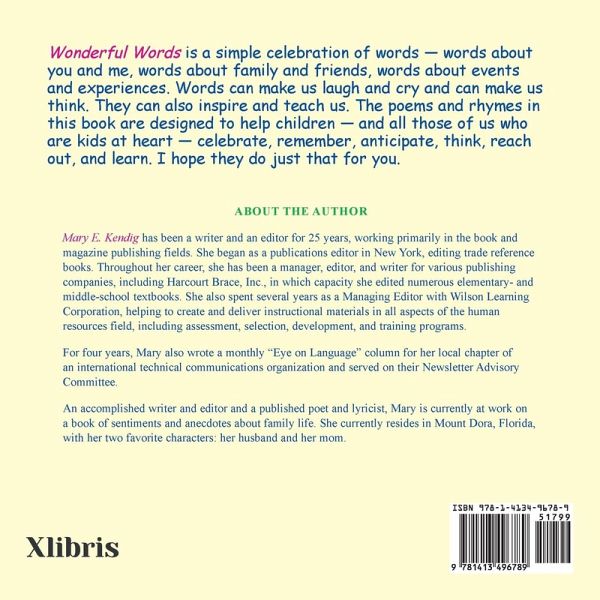 Wonderful Words is a simple celebration of words - words about you and me, words about family and friends, words about events and experiences, and words that explain elements of language and how we communicate with one another. Words can make us laugh and cry and can make us think. They can also inspire and teach us. The poems and rhymes in this book are designed to help children - and all those of us who are kids at heart - celebrate, remember, anticipate, think, reach out, and learn. I hope they do just that for you.