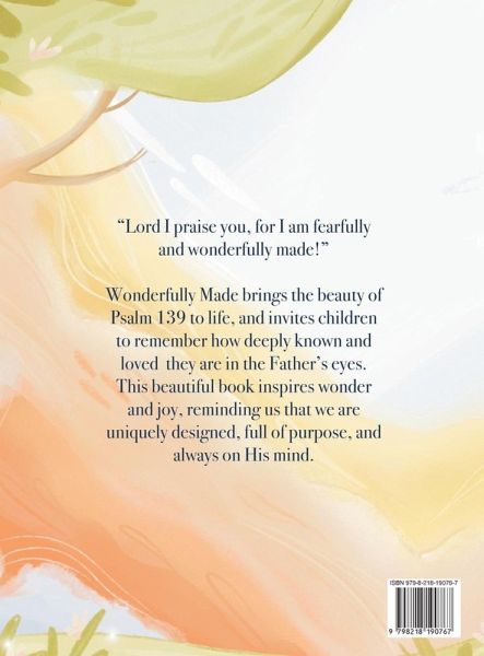 "Lord I praise you, for I am fearfully and wonderfully made! "Wonderfully Made brings Psalm 139 to life, and invites children to remember how deeply known and loved they are in the Father's eyes. This beautiful book inspires wonder and joy, reminding us that we are uniquely designed, full of purpose, and always on His mind. Great for 3-10 year olds Includes a lyrical poem inspired by Psalm 139 Beautifully illustrated and Biblically faithful Perfect for baby showers, first communions, and bedtime reading. The full Psalm in the Passion Translation is provided at the end of the book Encourages little ones to see themselves through the Father's eyes!