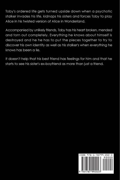 Toby's ordered life gets turned upside down when a psychotic stalker invades his life, kidnaps his sisters and forces Toby to play Alice in his twisted version of Alice in Wonderland. Accompanied by unlikely friends, Toby has his heart broken, mended and torn out completely. Everything he knows about himself is destroyed and he he has to put the pieces together to try to discover his own identity as well as his stalker's when everything he knows has been a lie. It doesn't help that his best friend has feelings for him and that he starts to see his sister's ex-boyfriend as more than just a friend.
