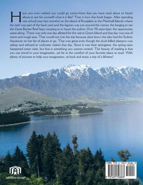 Have you ever wished you could go somewhere that you have read about or heard about to see for yourself what it is like? That is how this book began. After spending one school year (ten months) on the island of Kwajalein in the Marshall Islands where the reef was part of the back yard and the lagoon was just around the corner, the longing to see the Great Barrier Reef kept creeping in to haunt the author. Over 50 years later, the opportunity came along. There was only one day allotted for the visit to Green Island and that day was one of storm and rough seas. That would not ruin the trip because Jane knew she also had the Sydney Aquarium on her list of places to go. That was great even though the duck-billed platypus was asleep and refused to welcome visitors that day. Since it was their springtime, the spring rains hampered some visits, but that is something you cannot control. The beauty of reading is that you can travel in your imagination, yet be in the comfort of your favorite place to read. With plenty of pictures to help your imagination, sit back and enjoy a trip of a lifetime!