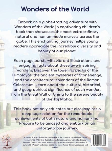 Embark on a globe-trotting adventure with Wonders of the World, a captivating children's book that showcases the most extraordinary natural and human-made marvels across the globe. This enchanting journey helps young readers appreciate the incredible diversity and beauty of our planet. Each page bursts with vibrant illustrations and engaging facts about these awe-inspiring wonders. Discover the towering peaks of the Himalayas, the ancient mysteries of Stonehenge, and the architectural splendors of the Roman Colosseum. Learn about the cultural, historical, and geographical significance of each wonder, from the Great Wall of China to the serene beauty of the Taj Mahal. This book not only educates but also inspires a deep appreciation for the remarkable achievements of both nature and humankind. Prepare to be amazed and embark on an unforgettable journey.