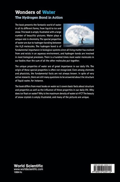The book presents the fantastic world of water in all its different forms, from liquid to ice and snow. This book is amply illustrated with a large number of beautiful pictures with. Water plays a unique role in chemistry. The special properties of water are due to hydrogen bonding between the H2O molecules. The hydrogen bond is of fundamental importance in biological systems since all living matter has evolved from and exists in an aqueous environment, and hydrogen bonds are involved in most biological processes. There is a hundred times more water molecules in our bodies than the sum of all the other molecules put together. The unique properties of water are of great importance in our daily life. The origin of these special properties is often not recognized. Even among chemists and physicists, the fundamental facts are not always known. In spite of very active research, there are still many questions to be answered about the structure of liquid water, for instance. The book differs from most books on water as it covers basic facts about structure and properties as well as the influence of these properties in our daily life. Why does ice float on water? Why is the maximum density of water at 4°C? The beauty of snow crystals is amply illustrated, and many of the pictures are unique.