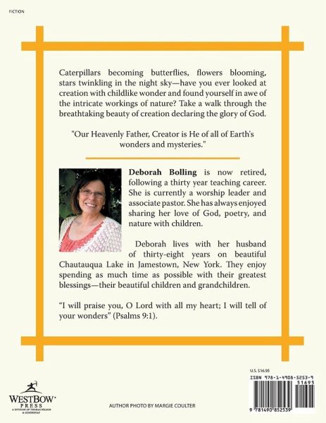 Deborah Bolling is now retired, following a thirty year teaching career. She is currently a worship leader and associate pastor. She has always enjoyed sharing her love of God, poetry, and nature with children. Deborah lives with her husband of thirty-eight years on beautiful Chautauqua Lake in Jamestown, New York. They enjoy spending as much time as possible with their greatest blessings-their beautiful children and grandchildren. "I will praise you, O Lord with all my heart; I will tell of your wonders" (Psalms 9:1).