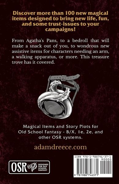 Over 100 new magical items for Old-School Essentials, and your favorite old school fantasy systems (B/X, RC, 1e, 2e) from award-winning author Adam Dreece. Bring a wealth of magical items, from the subtle to the sublime, from the thunderous to the twisted, to your table. All-new magical weapons, armor, garments, rings, wands, and more. This volume also includes several assistive magical items, like the Wheels of Xamin and the Arm of Naguib. Many magical items have their own micro-story, designed to inspire and delight. This volume also includes 7 story plots to get you up and going. Magical items have been grouped by type (rogue, spellcaster, etc) for B/X and Advanced fantasy compatibility (class & class-as-race).