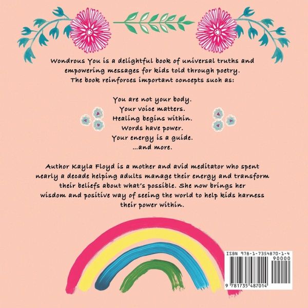 ---WINNER OF THE SILVER MEDAL IN THE MOONBEAM CHILDREN'S BOOK AWARDS- Wondrous You is a delightful book of 12 empowering poems that teach kids about mindfulness, self-worth, resilience and body positivity. The book reinforces important concepts such as:You are not your body. Your voice matters. Healing begins within. Words have power. Your energy is a guide. And more. Beautifully illustrated with full-page affirmation layouts accompanying each inspirational poem, Wondrous You is a useful tool for starting important conversations between adults and children. This joyful book puts words to concepts that help children make sense of the world around them while cultivating mindfulness and self-worth.